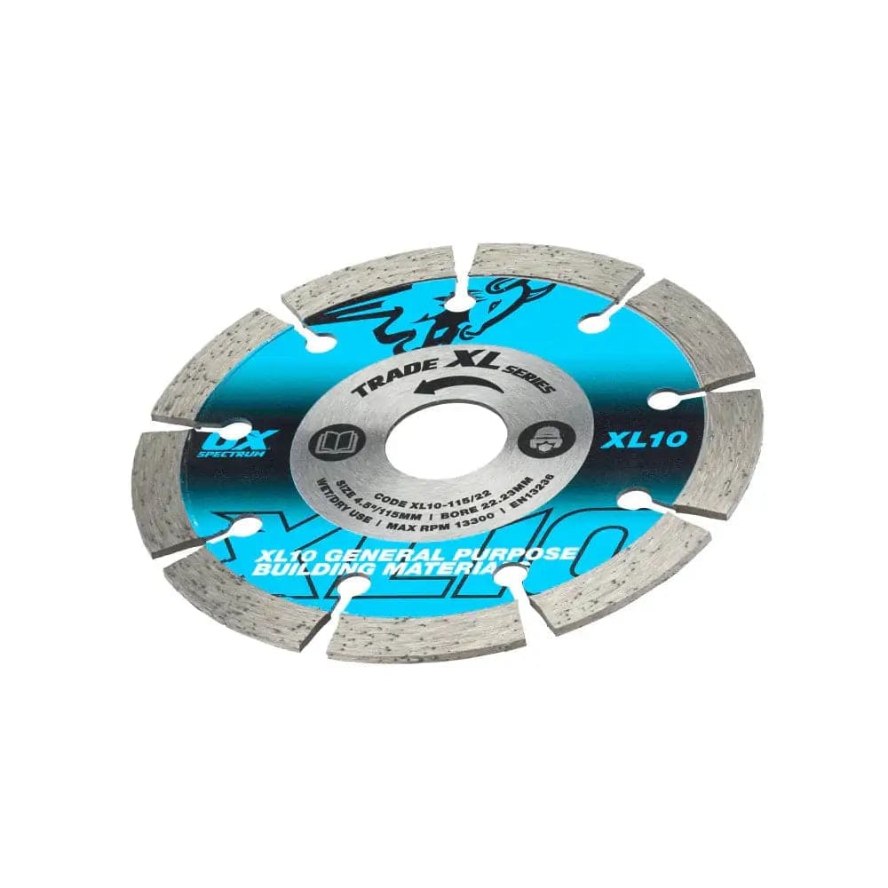 The OX Trade XL-10 Segmented Diamond Blade – 115mm x 22.23mm is a general-purpose cutting disc designed for use with angle grinders on a wide range of building materials.