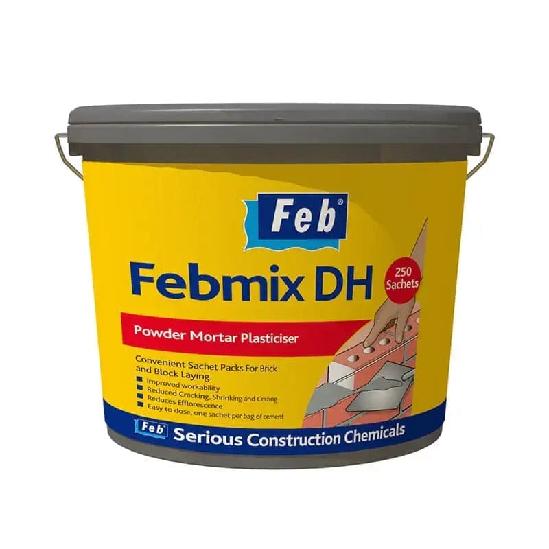Everbuild Febmix DH Powder Mortar Plasticizer – 250 Sachet Tub is a convenient, pre-measured powdered admixture designed to improve the workability of mortar mixes without the need for liquid plasticisers.